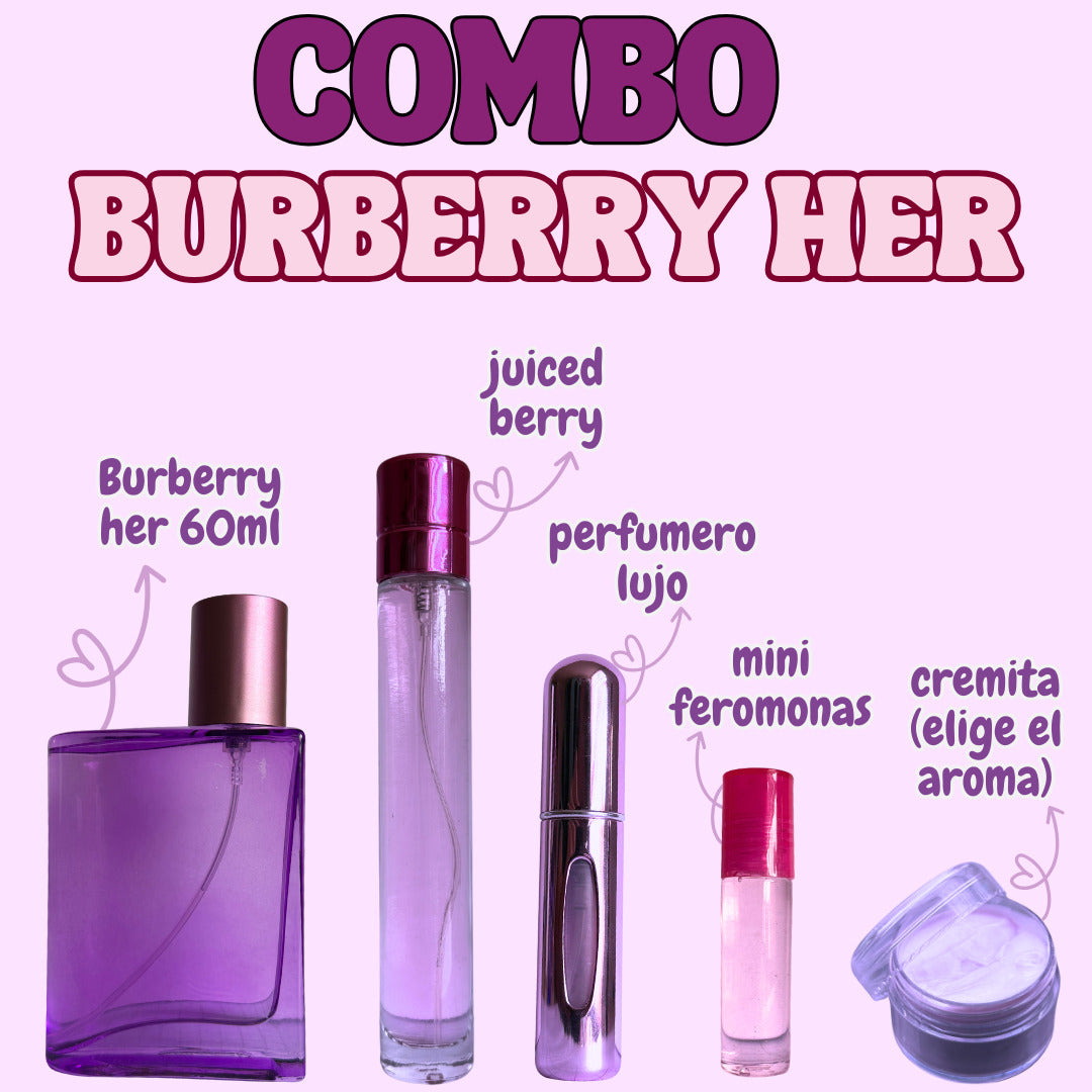 Combo con 5 productos, el cual se caracteriza por tener el perfume Burberry Her en envase de lujo de 60ml con un aroma muy femenino con notas de fresa y frambuesa, incluye otro perfume de 30ml Juiced Berry aroma frutal. ¡Eleva tus perfumes con los potenciadores del combo!