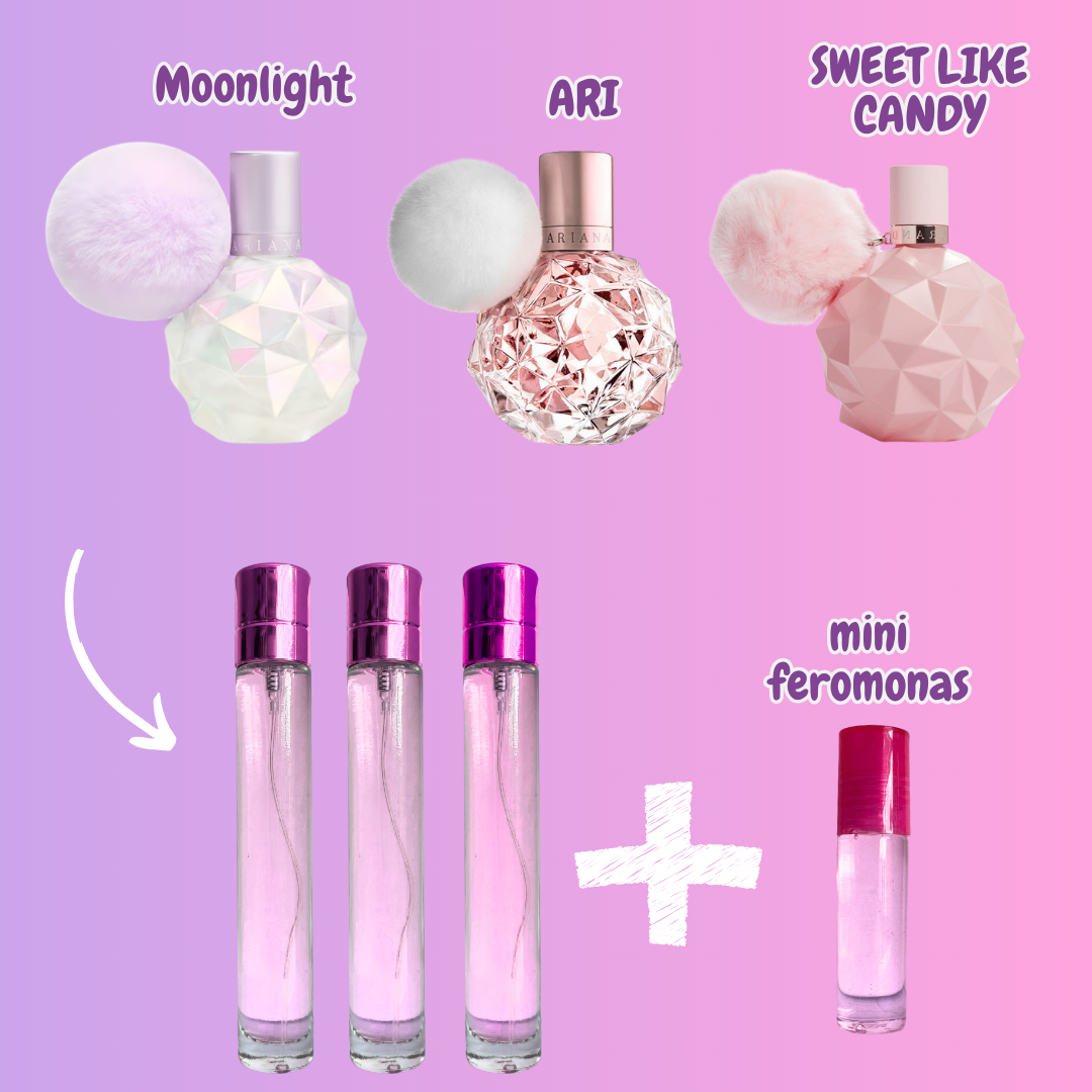 🌙 Moonlight - Misterioso y seductor, con notas de ciruela negra, sándalo y malvaviscos que crean una experiencia nocturna inolvidable y envolvente.💎 ARI - Elegante y femenino, combina frambuesa, toronja y vainilla en una mezcla sofisticada que refleja glamour y confianza en cada aplicación.🍬 Sweet Like Candy - Dulce y vibrante, con una explosión de frutas azucaradas y un toque floral que te hará sentir irresistible y llena de energía.