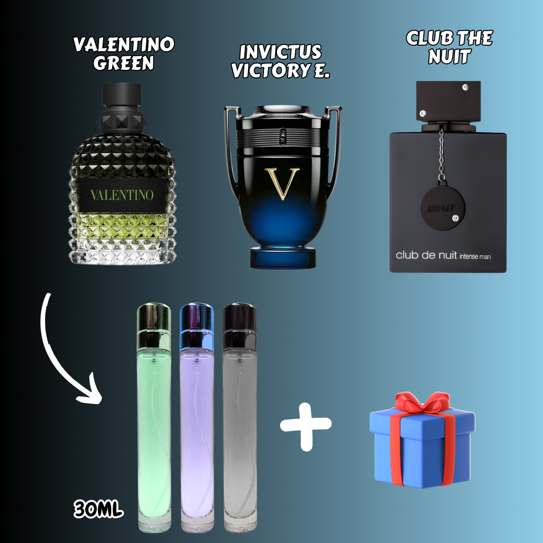 El set exclusive es ideal para los hombres que les gusta los aromas fuertes de madera con un toque cítrico. Club de Nuit o más conocido como la bestia negra es un perfume ideal para un hombre con un tipo de pH fuerte. Invictus Victory Elixir es un perfume cálido con notas de ámbar y una nota leve de naranja, el cual lo hace perfecto para las noches. Valentino Green extravagancia es una versión aromática con una nota de café, perfecta para el clima frio.