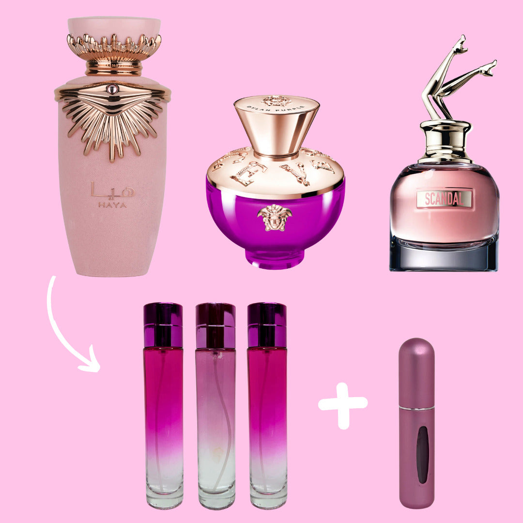 Cada uno te lo llevas en envases de 60ml y te obsequiamos un perfumero recargable para que puedas retocar tu perfume en cualquier lugar.